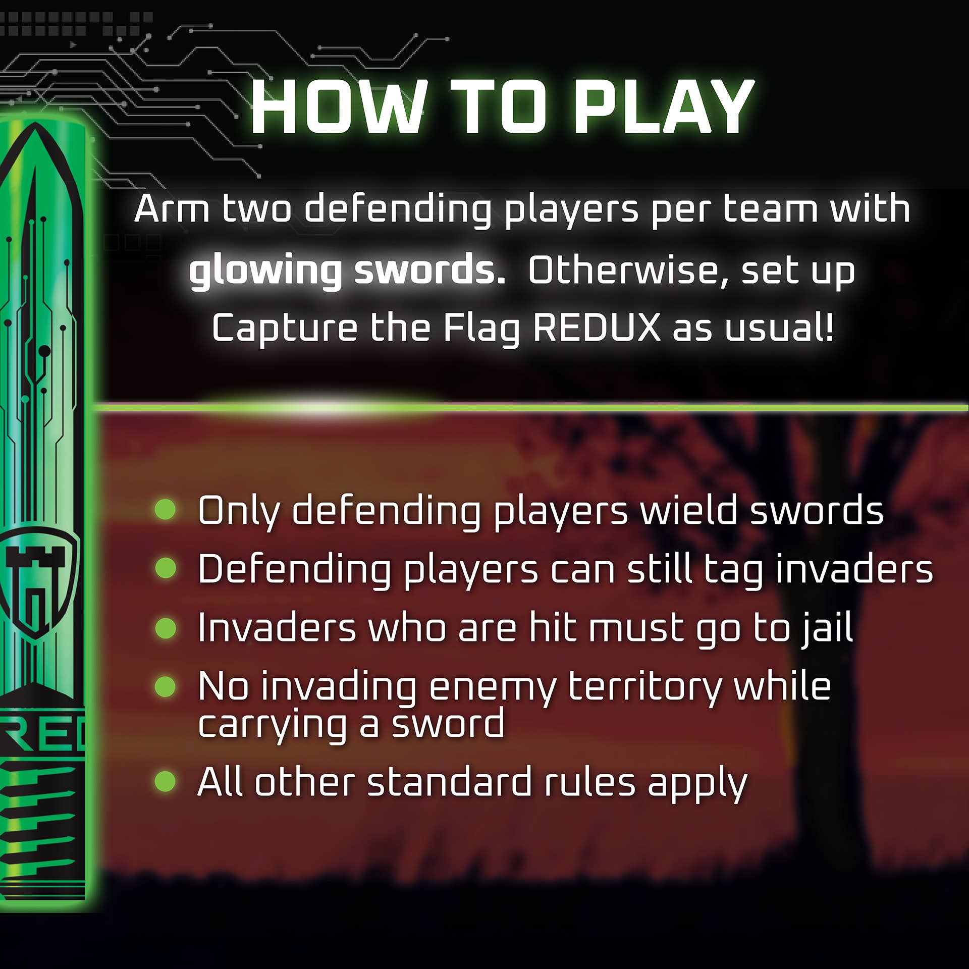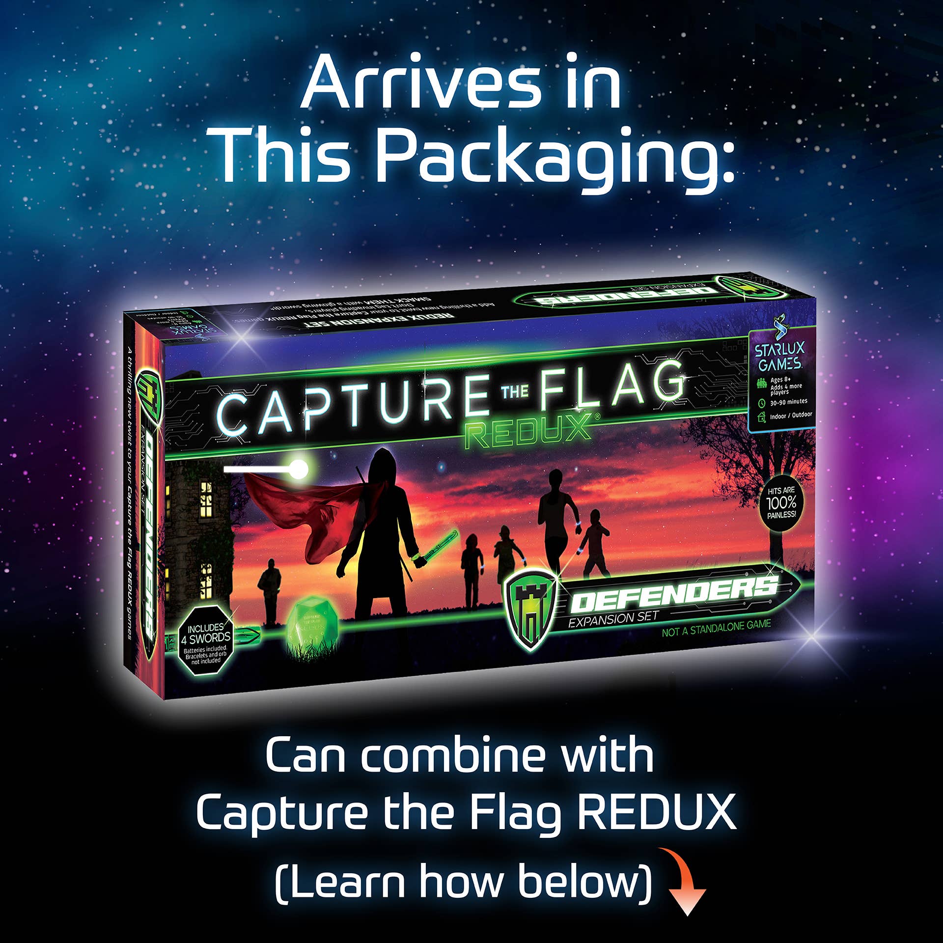 Add glowing swords to your Capture the Flag REDUX games! Defending players guard their turf with extra defenses as they wield (harmless!) swords, two per team. All other Capture the Flag rules apply. Adds 4 swords and up to 4 players to Capture the Flag REDUX, for Ages 8+. By Starlux Games
